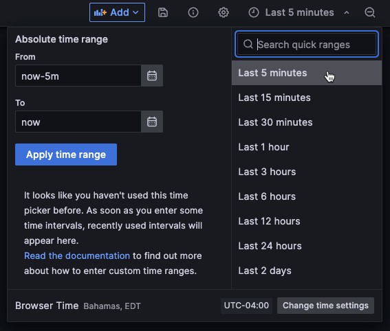 now-24h, and then click Apply time range. - Click in the From or To field. Grafana displays a calendar. Click the day or days you want to use as the current time range and then click Apply time range.