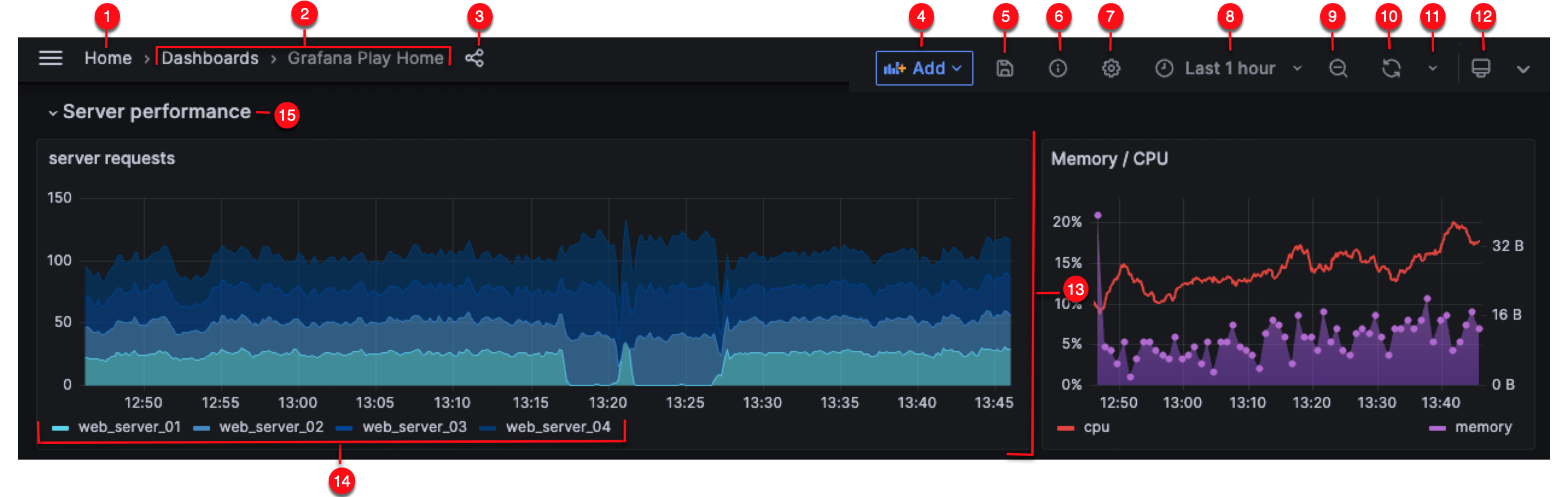 - (13) Dashboard panel: The primary building block of a dashboard is the panel. To add a new panel, dashboard row, or library panel, click Add panel.