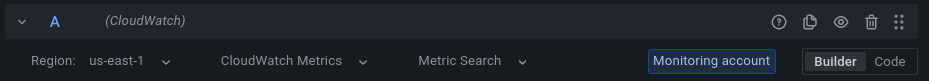 Cross-account querying is available in the plugin through the Logs mode and the Metric search mode. Once you have it configured correctly, you’ll see a “Monitoring account” badge displayed in the query editor header.