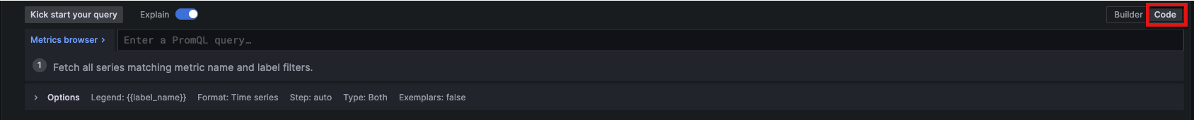 Code mode is for the experienced Prometheus user with prior expertise in PromQL, Prometheus’ query language. The Code mode editor allows you to create queries just as you would in Prometheus. For more information about PromQL see Querying Prometheus.