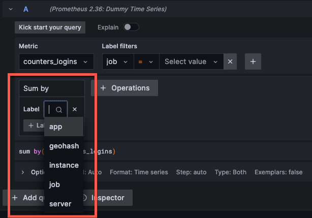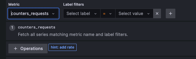 The user interface (UI) also lets you select metrics, labels, filters and operations.