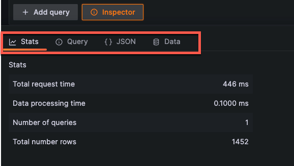 Click Inspector to get detailed statistics regarding your query. Inspector functions as a kind of debugging tool that “inspects” your query. It provides query statistics under Stats, request response time under Query, data frame details under {} JSON, and the shape of your data under Data.