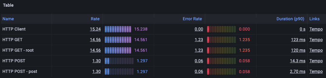 To open a query in Tempo with the span name of that row automatically set in the query, click a row in the links column.