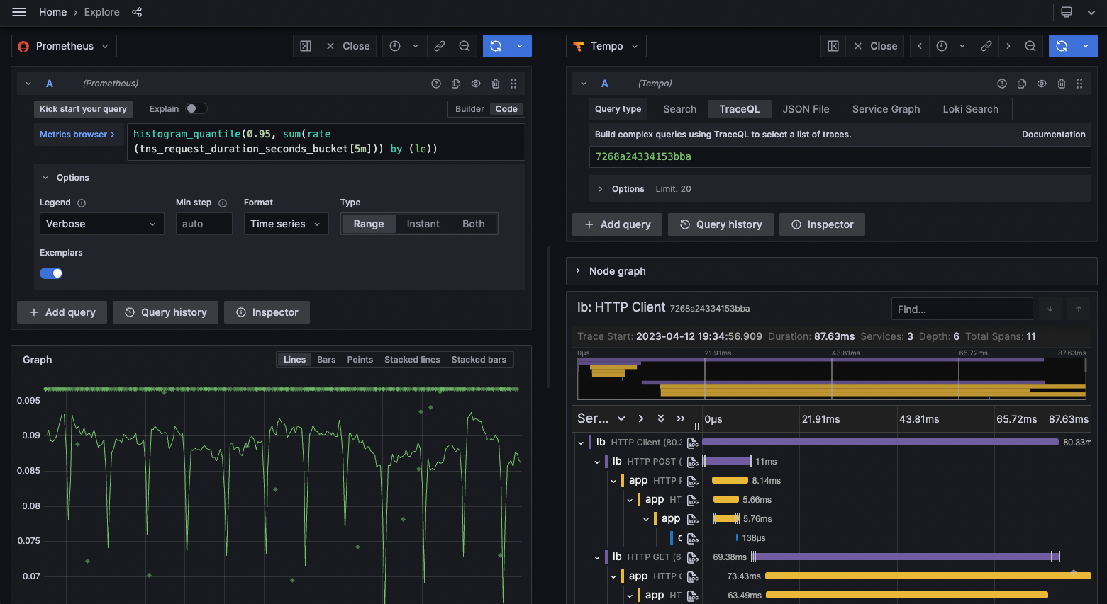 Refer to View exemplar data for instructions on how to drill down and view exemplar trace details from metrics and logs. To know more about exemplars, refer to the blogpost Intro to exemplars, which enable Grafana Tempo’s distributed tracing at massive scale.