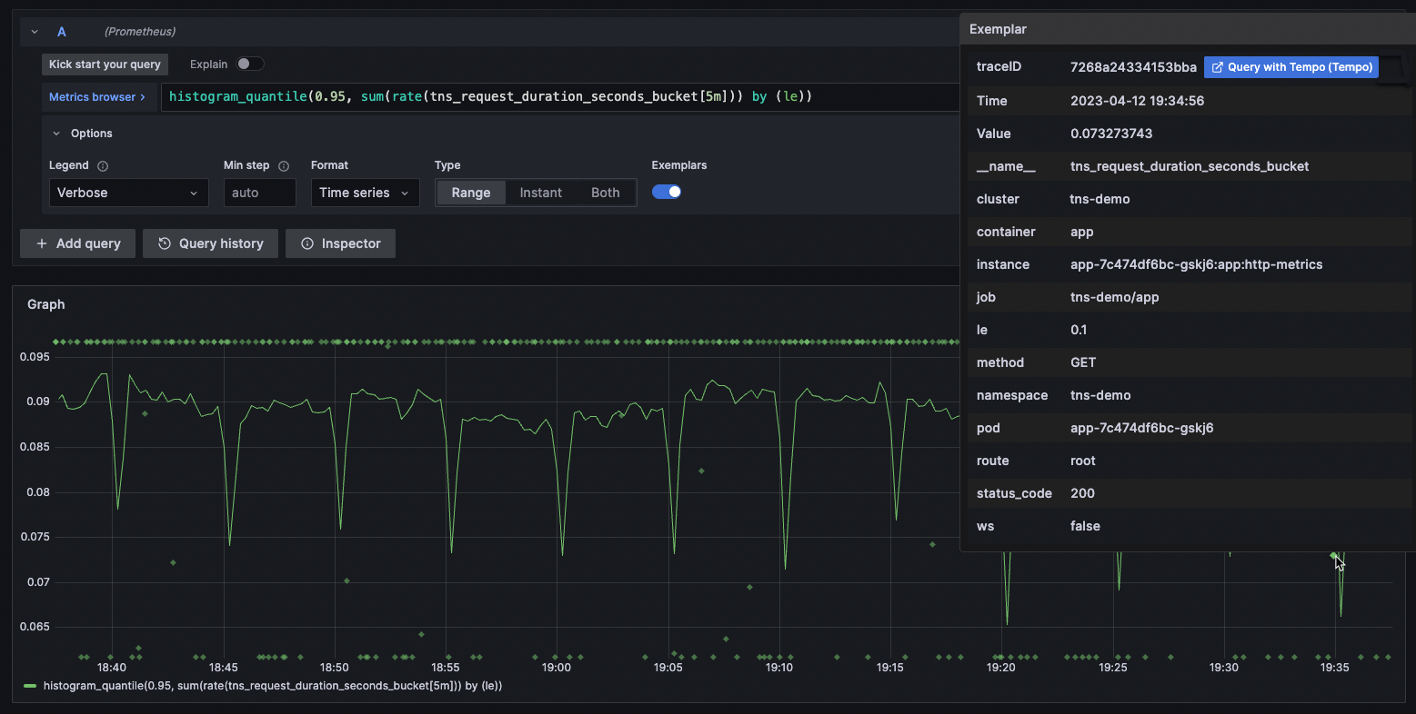 Query with <data source name>. In the following example, the tracing data source is Tempo.![Screenshot showing exemplar details Screenshot showing exemplar details]()