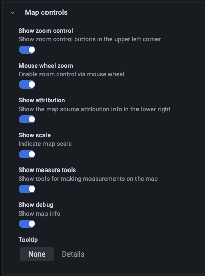 auto,dark, andlighttheme for the base map and can be set as shown below. TheshowLabelstag determines whether or not Grafana shows the Country details on top of the map. Here is an example: