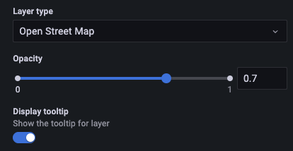 - Add layer creates an additional, configurable data layer for the geomap. When you add a layer, you are prompted to select a layer type. You can change the layer type at any point during panel configuration. See the Layer Types section above for details on each layer type.