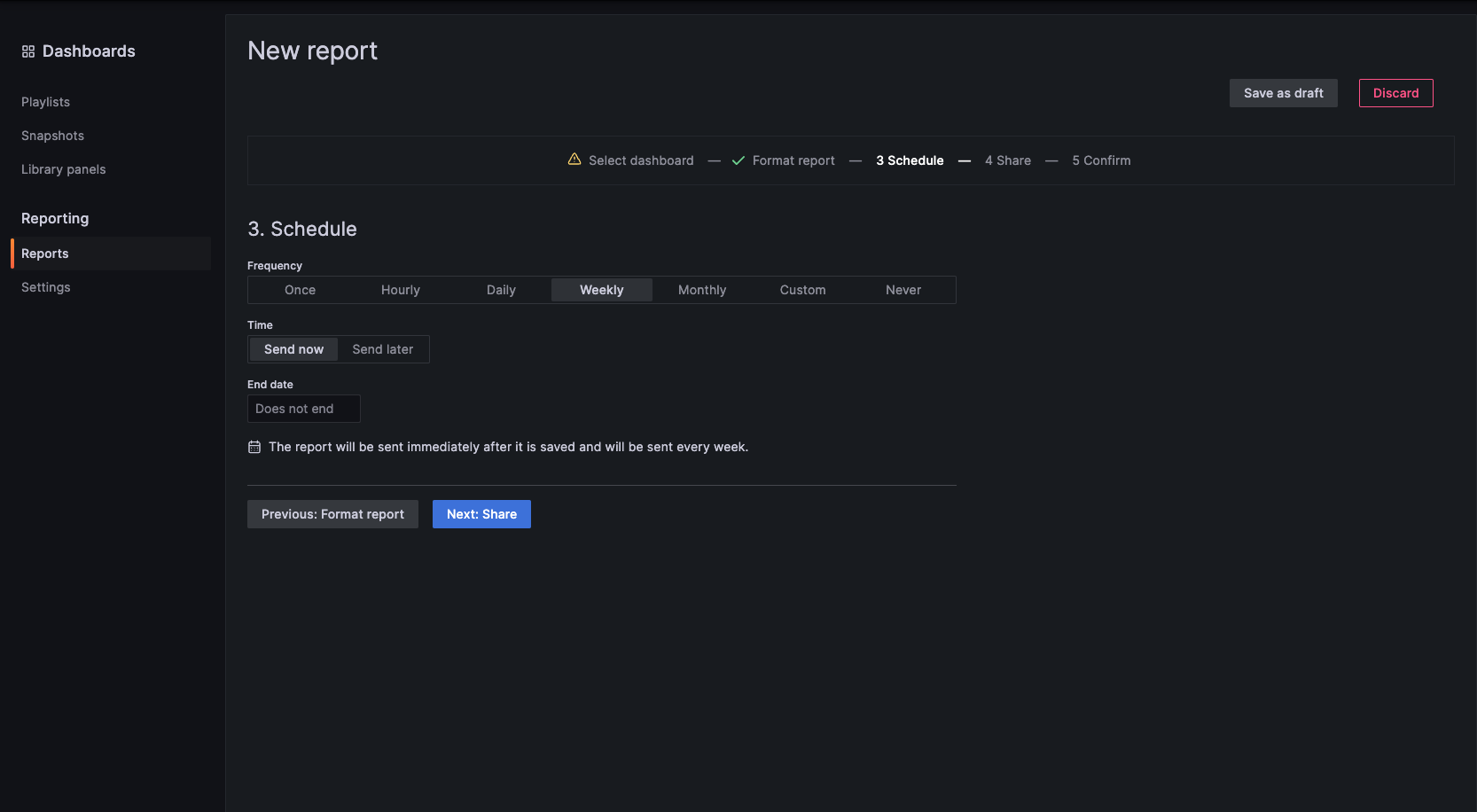 We updated the reporting UI to better fit the new navigation style, adding a horizontal slider and moving the Preview and Send buttons to the Action section in the page. We also fixed the alignment of the different sections.