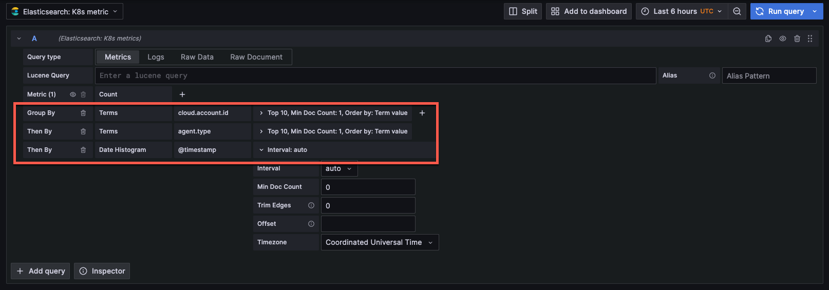 Group bywhen creating a metrics query in the query builder.Metrics - Metrics aggregations perform calculations such as sum, average, min, etc. They can be single-value or multi-value. See Metrics aggregations for additional information. Use metrics aggregations in the metrics query type in the query builder.