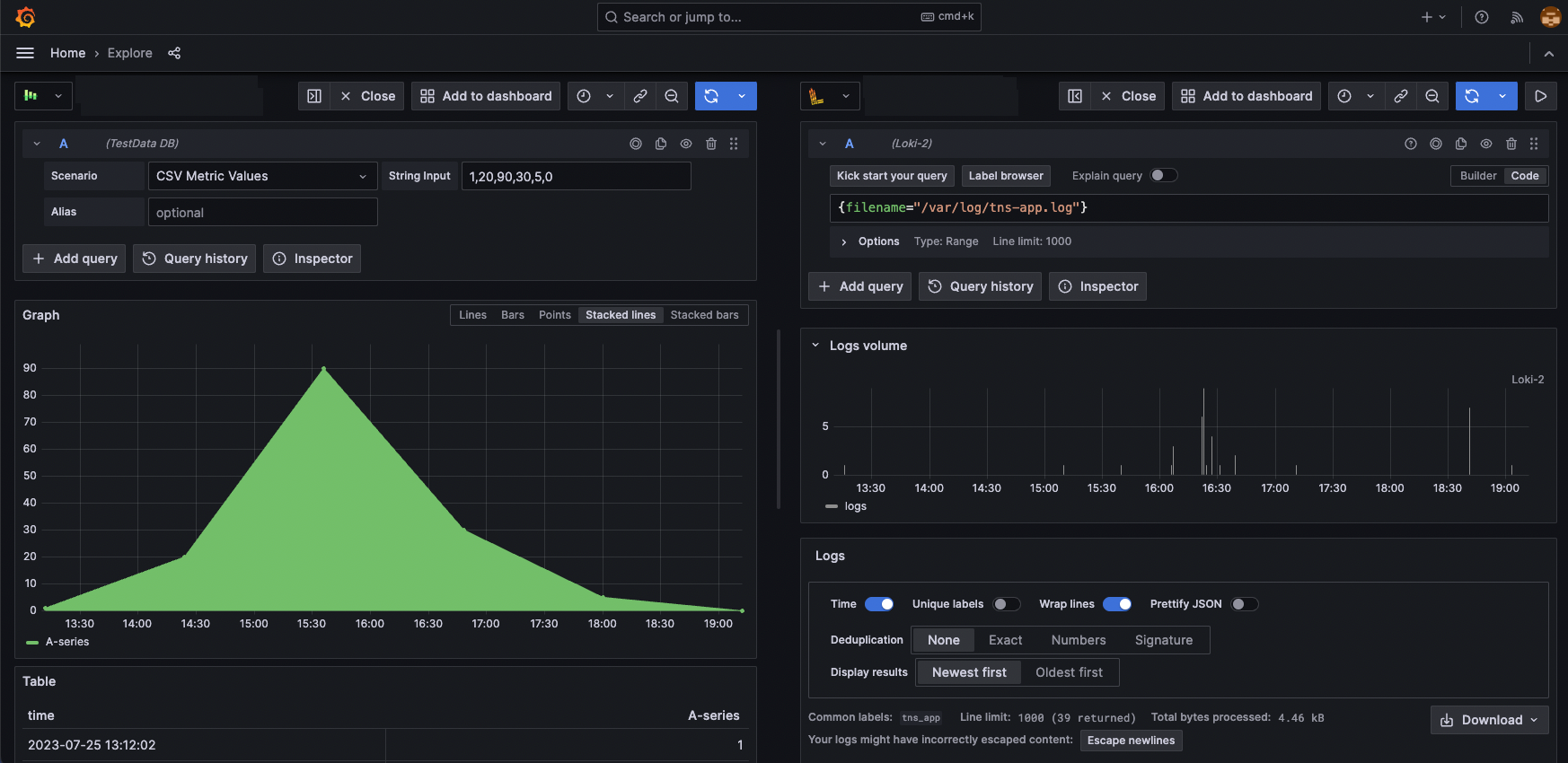 If you just want to explore your data and do not want to create a dashboard, then Explore makes this much easier. If your data source supports graph and table data, then Explore shows the results both as a graph and a table. This allows you to see trends in the data and more details at the same time. See also: