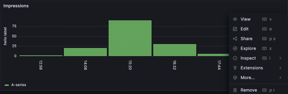 Alternately to start with an existing query in a panel, choose the Explore option from the Panel menu. This opens an Explore tab with the query from the panel and allows you to tweak or iterate in the query outside of your dashboard.
