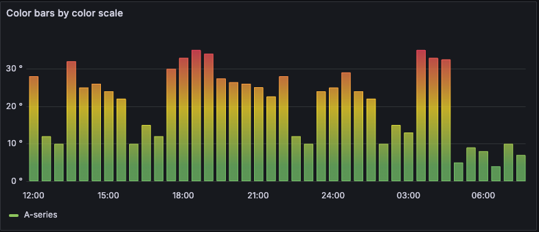 From thresholds - If the Color scheme selection is From thresholds (by value), then each bar is the color of the defined threshold.