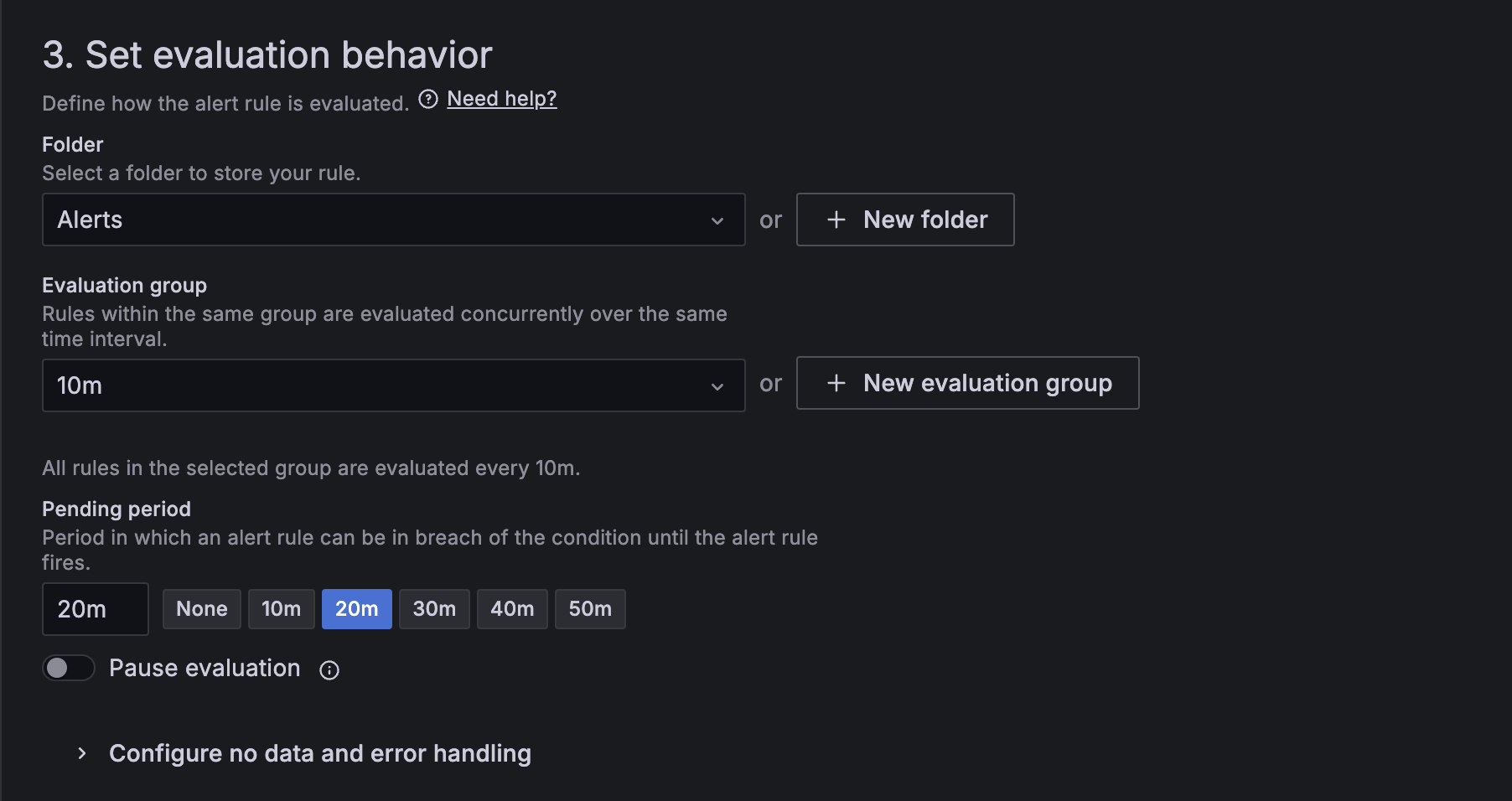 Every alert rule is assigned to an evaluation group. You can assign the alert rule to an existing evaluation group or create a new one.