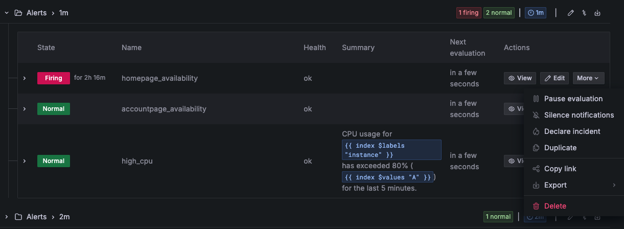 Each alert rule shows its state, health, summary, next evaluation time, and available actions such as Pause evaluation, Silence notifications, Export, Delete, and more.