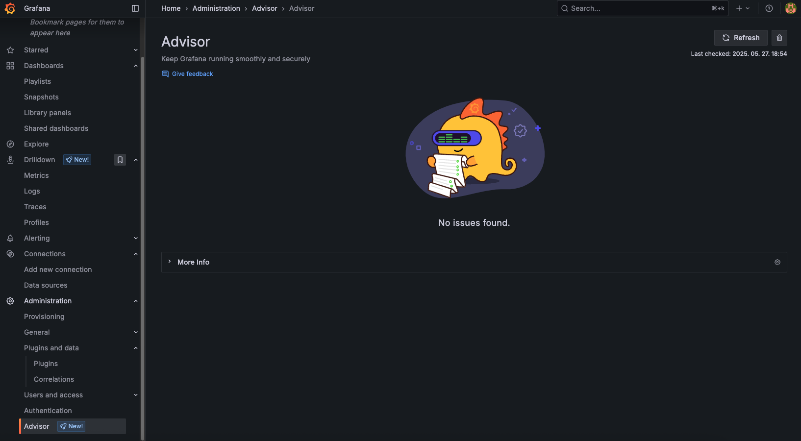 Currently, Grafana Advisor performs regular checks on data sources, plugins, and your Grafana instance, but we’re planning to expand its capabilities in future releases to cover more aspects of your Grafana environment.