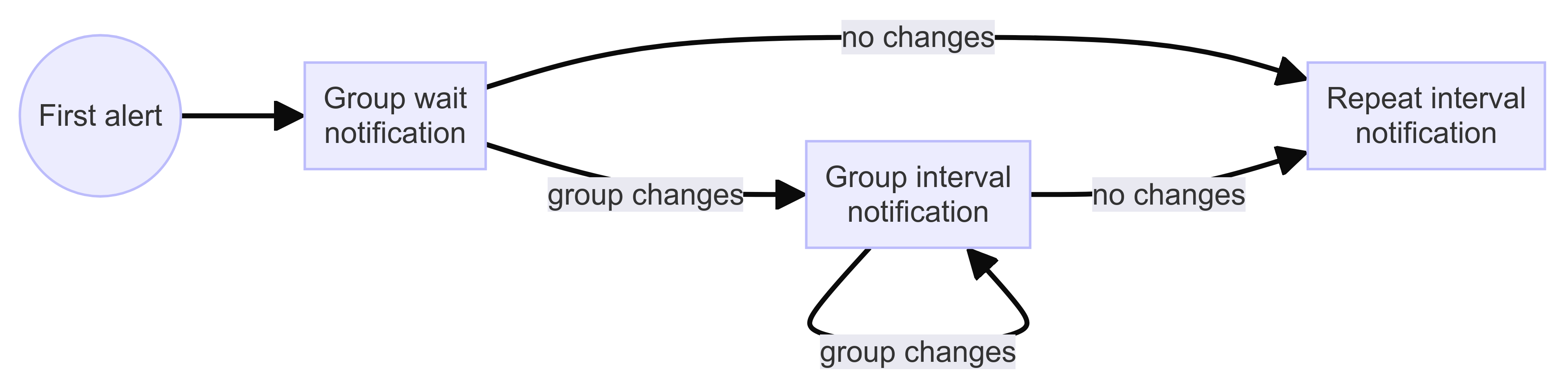 It’s important to note that an alert instance exits the group after being resolved and notified of its state change. When no alerts remain, the group is deleted, and then the group wait timer handles the first notification for the next incoming alert once again.