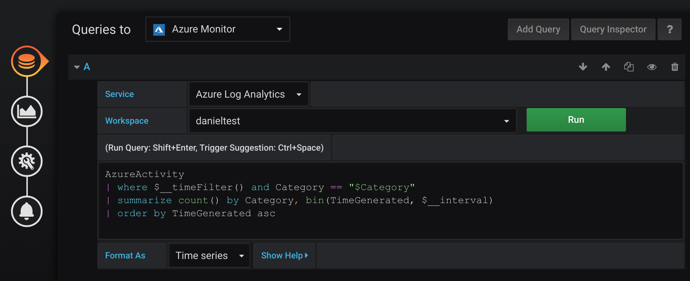The query editor will change depending on which one you pick. Azure Monitor is the default.
