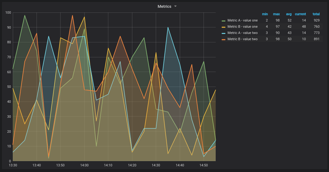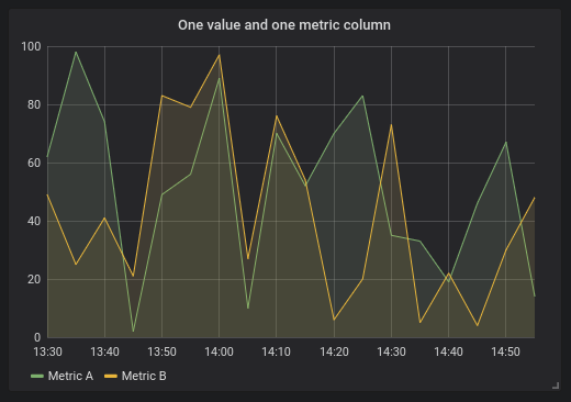 ORDER BY 1When above query are used in a graph panel the result will be two series named Metric A and Metric B with value of valueOne and valueTwo plotted over time.