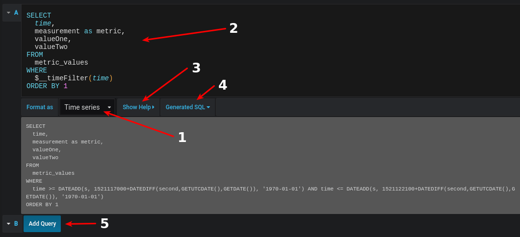 If you set Format as to Time series, for use in Graph panel for example, then the query must must have a column named time that returns either a sql datetime or any numeric datatype representing Unix epoch in seconds. You may return a column named metric that is used as metric name for the value column. Any column except time and metric is treated as a value column. If you omit the metric column, the name of the value column will be the metric name. You may select multiple value columns, each will have its name as metric.