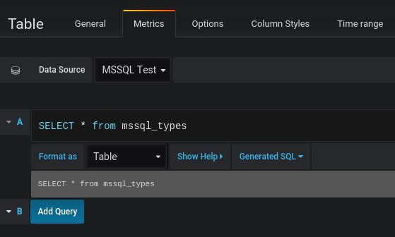 You find the MSSQL query editor in the metrics tab in Graph, Singlestat or Table panel’s edit mode. You enter edit mode by clicking the panel title, then edit. The editor allows you to define a SQL query to select data to be visualized.