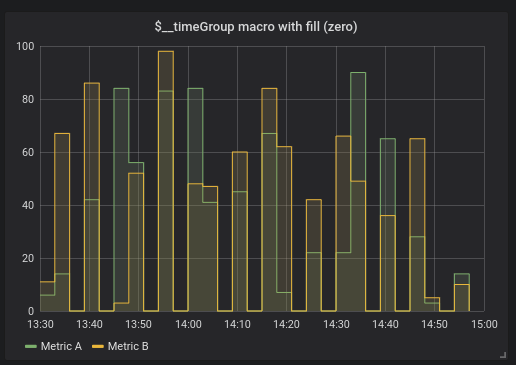 Example using the $__timeGroup macro with fill parameter set to zero: