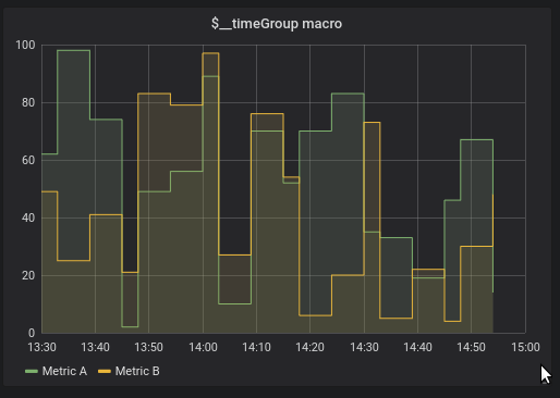 ORDER BY 1When above query are used in a graph panel the result will be two series named Metric A and Metric B with a sum of valueTwo plotted over time.