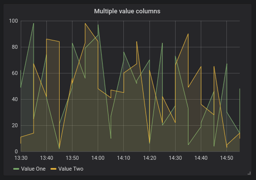 ORDER BY 1When above query are used in a graph panel the result will be two series named valueOne and valueTwo with value of valueOne and valueTwo plotted over time.