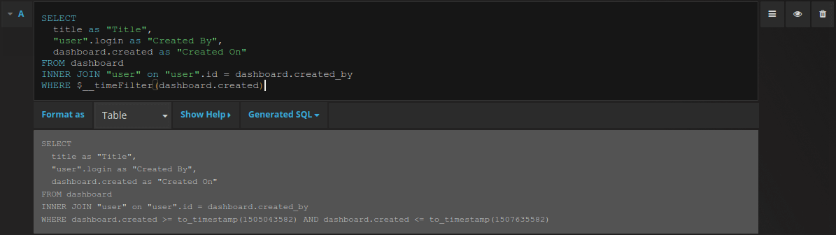WHERE $__timeFilter(dashboard.created)You can control the name of the Table panel columns by using regular as SQL column selection syntax.