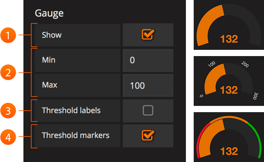 - Show: The show checkbox will toggle whether the gauge is shown in the panel. When unselected, only the Singlestat value will appear.