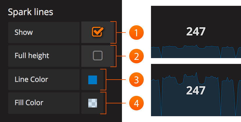 - Show: The show checkbox will toggle whether the spark line is shown in the Panel. When unselected, only the Singlestat value will appear.