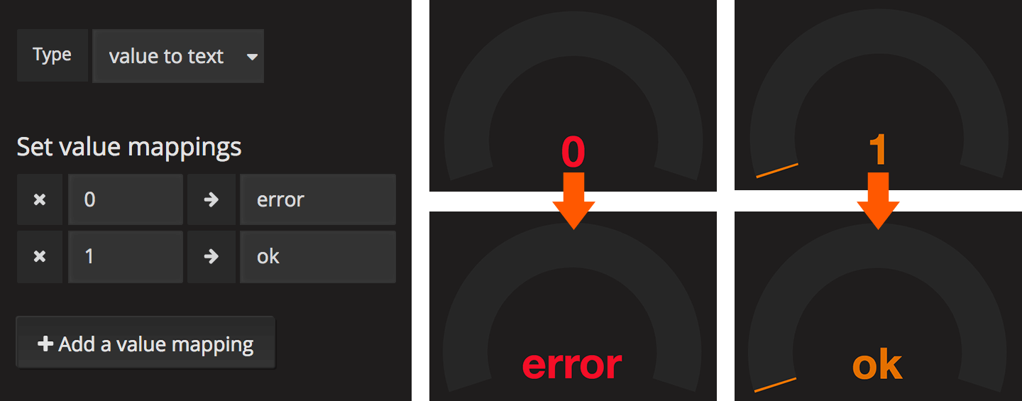 Value/Range to text mapping allows you to translate the value of the summary stat into explicit text. The text will respect all styling, thresholds and customization defined for the value. This can be useful to translate the number of the main Singlestat value into a context-specific human-readable word or message.