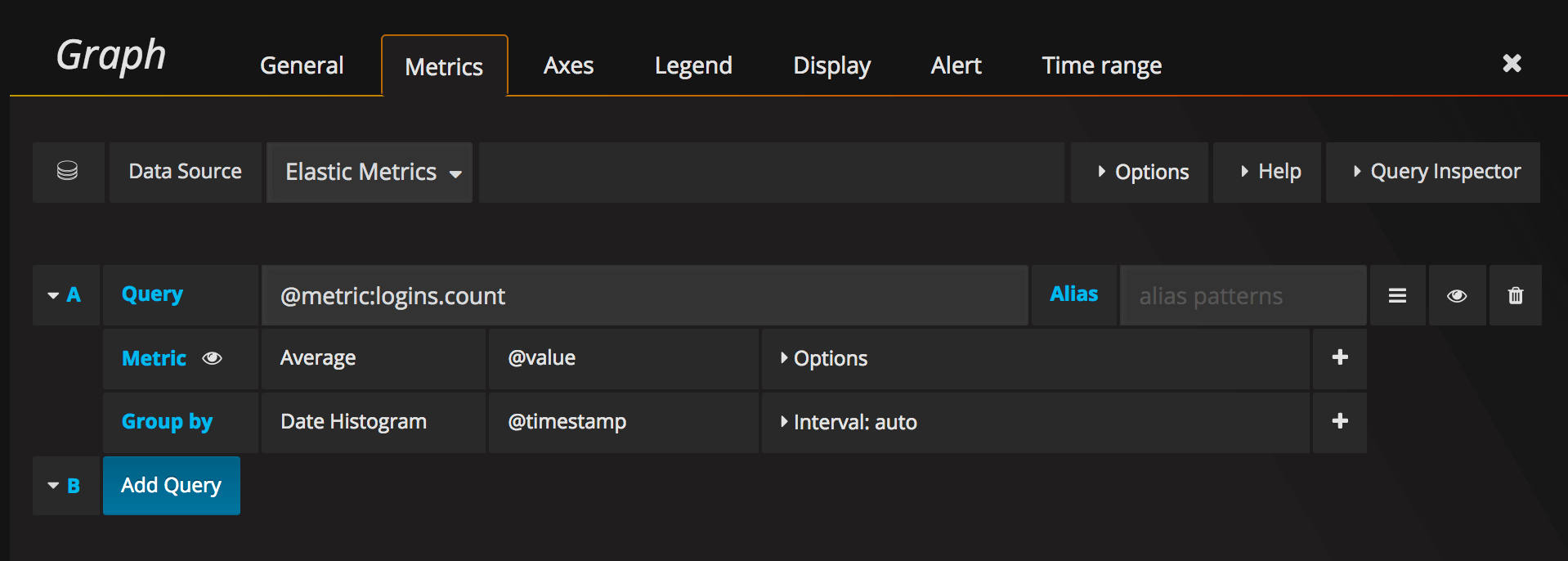 When you click the Metrics tab, you are presented with a Query Editor that is specific to the Panel Data Source. Use the Query Editor to build your queries and Grafana will visualize them in real time.