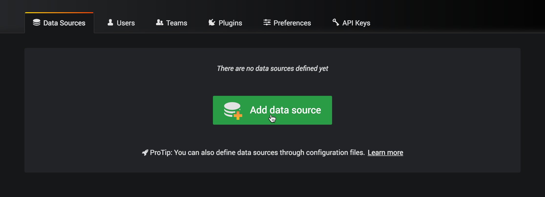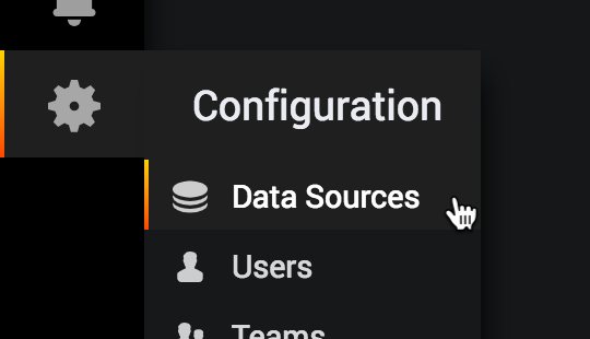First move your cursor to the cog on the side menu which will show you the configuration menu. If the side menu is not visible click the Grafana icon in the upper left corner. The first item on the configuration menu is data sources, click on that and you’ll be taken to the data sources page where you can add and edit data sources. You can also simply click the cog.
