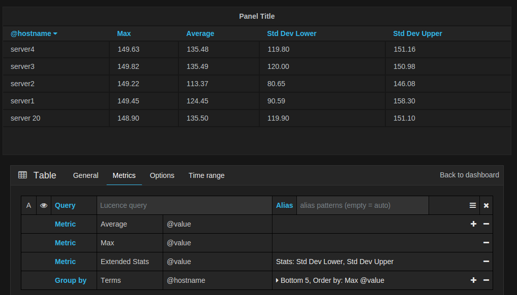 If you have Elasticsearch 2.x and Grafana 2.6 or above then you can use pipeline metric aggregations like Moving Average and Derivative. Elasticsearch pipeline metrics require another metric to be based on. Use the eye icon next to the metric to hide metrics from appearing in the graph.