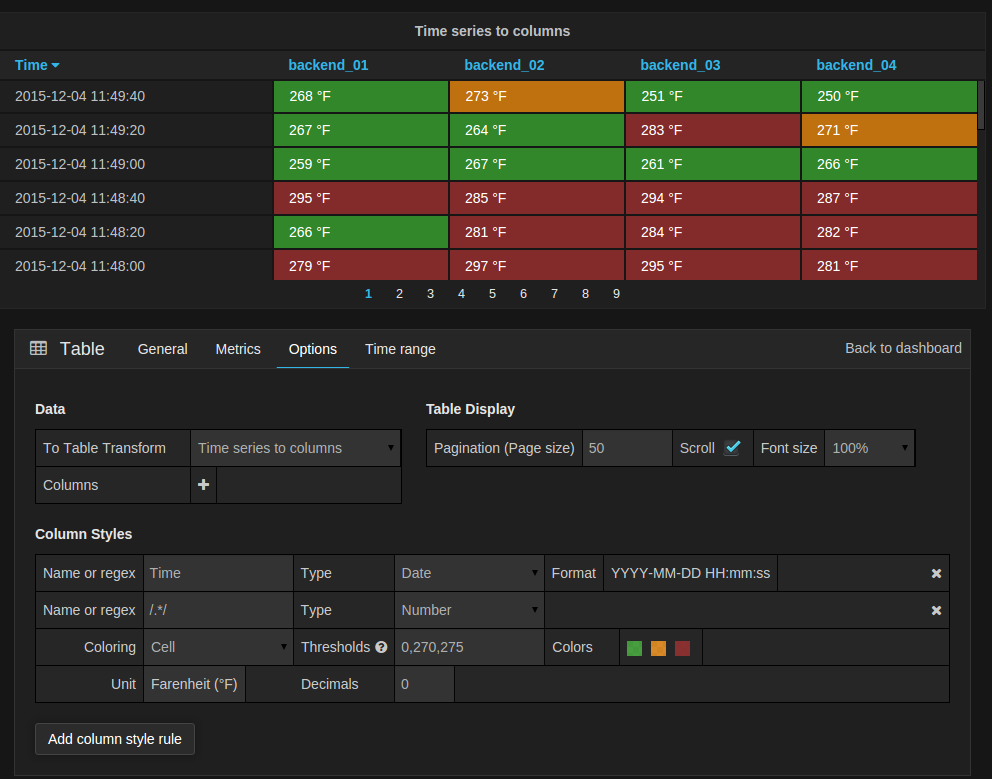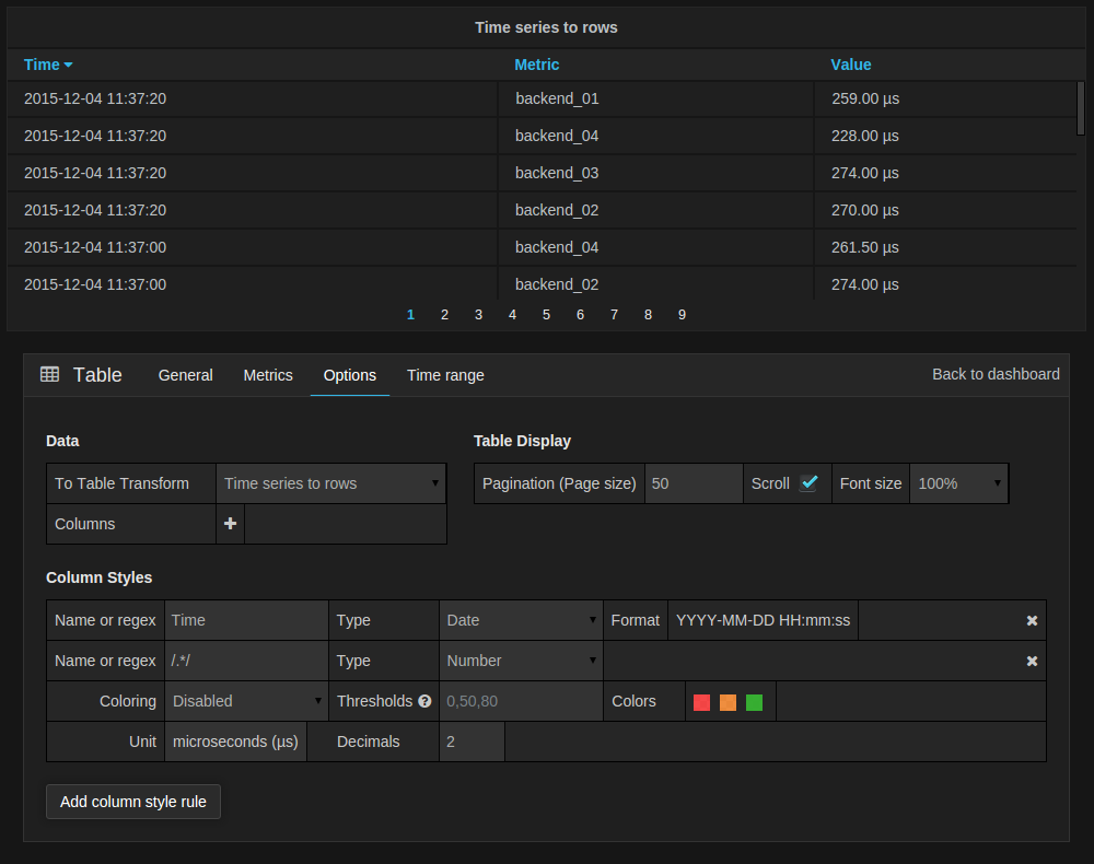 The new table panel is very flexible, supporting both multiple modes for time series as well as for table, annotation and raw JSON data. It also provides date formatting and value formatting and coloring options.
