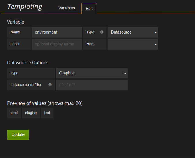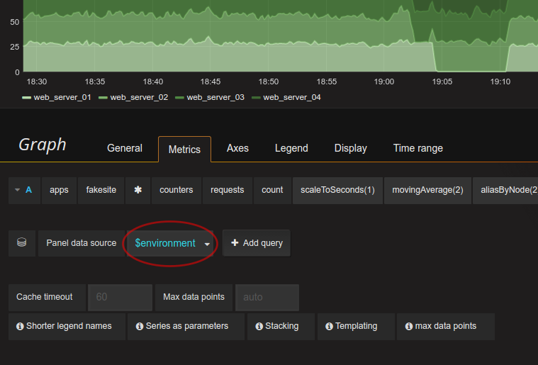 This will allow you to quickly change data source server and reuse the same dashboard for different instances of your metrics backend. For example you might have Graphite running in multiple data centers or environments.