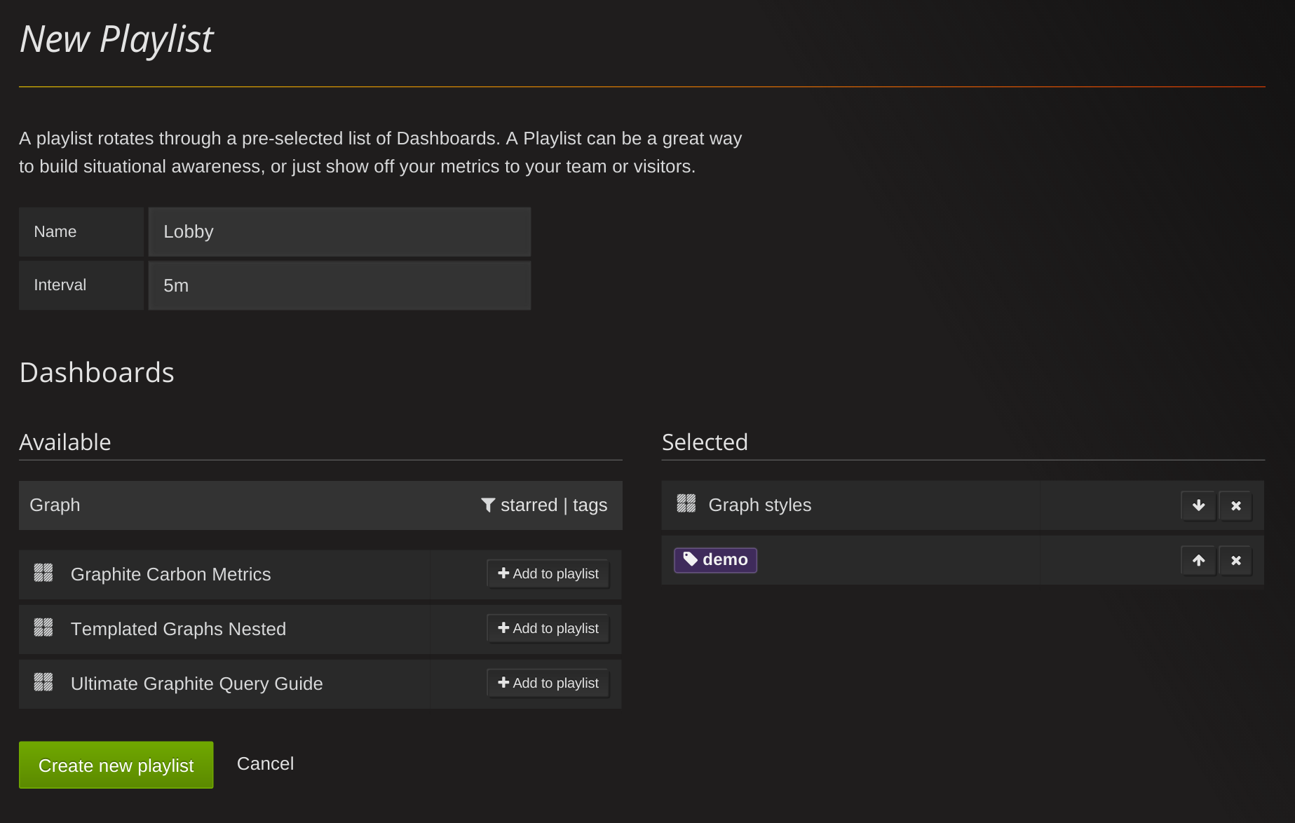 This is powerful as it allows you to remote control Grafana. If you have a big TV display showing Grafana in your company lobby, create a playlist named Lobby, and start it on the computer connected to the Lobby TV.