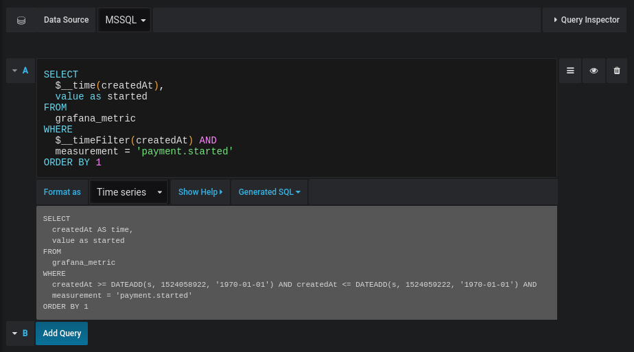 Grafana v5.1 now ships with a built-in Microsoft SQL Server (MSSQL) data source plugin that allows you to query and visualize data from any Microsoft SQL Server 2005 or newer, including Microsoft Azure SQL Database. Do you have metric or log data in MSSQL? You can now visualize that data and define alert rules on it like with any of Grafana’s other core data sources.