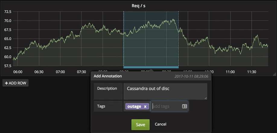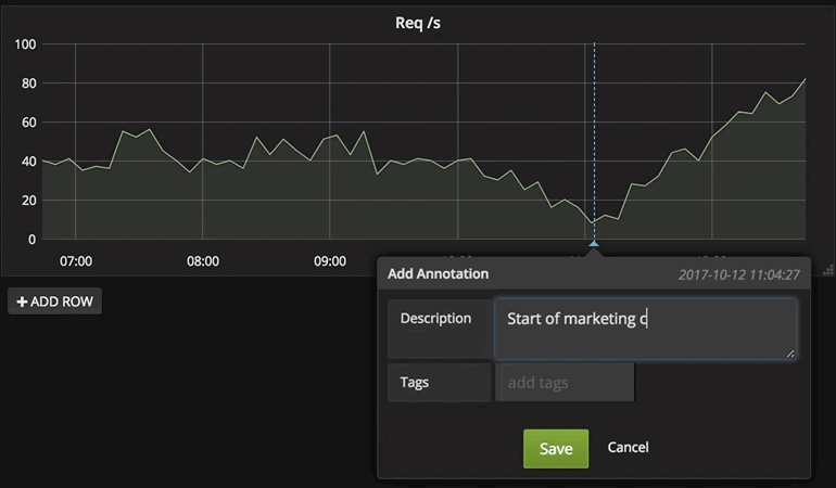 Annotations provide a way to mark points on the graph with rich events. When you hover over an annotation you can get event description and event tags. The text field can include links to other systems with more detail.