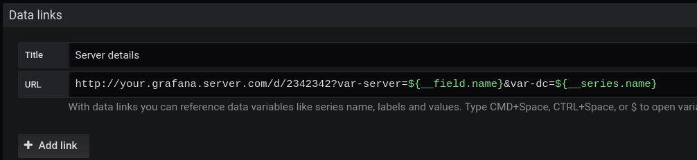 - URL field allows the URL configuration for a given link. Apart from regular query params it also supports built-in variables and dashboard variables that you can choose from available suggestions: