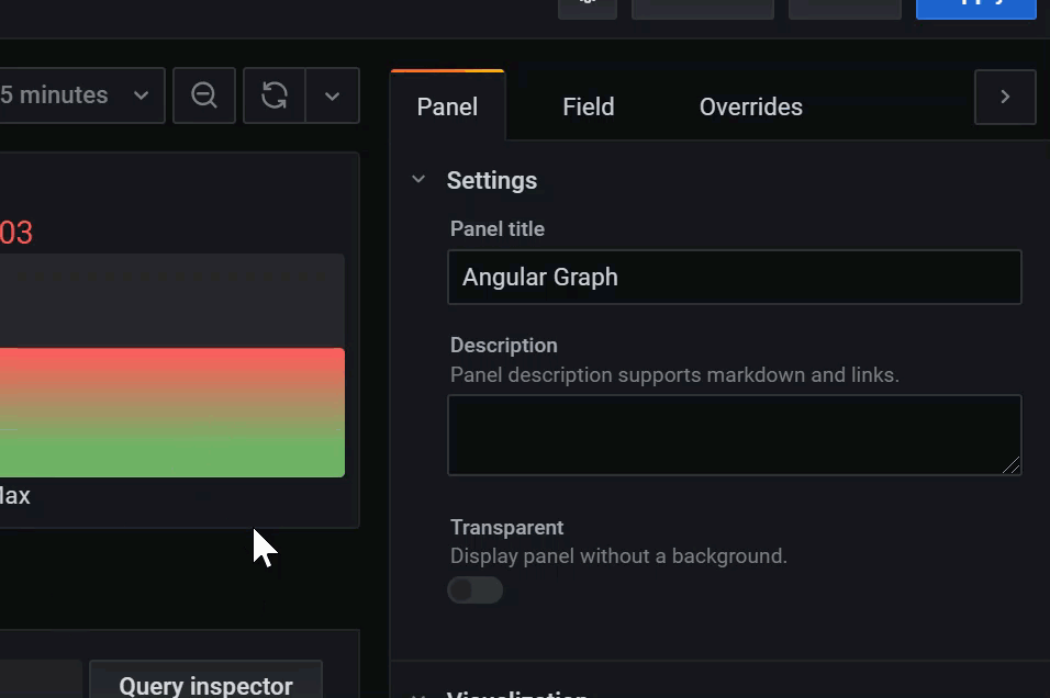 Drag to resize sections of the panel editor. If the side pane becomes too narrow, then the Panel, Field, and Overrides tabs change to a dropdown list.