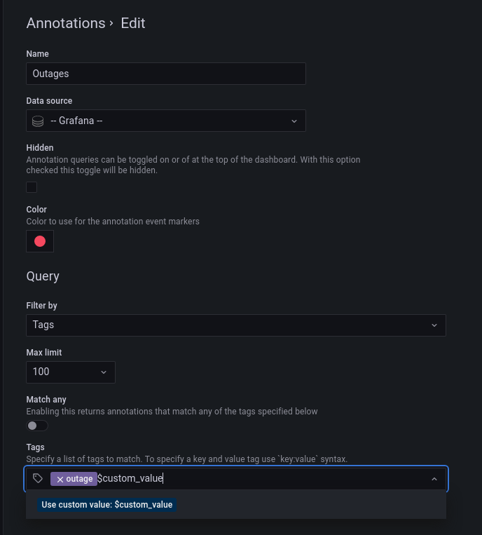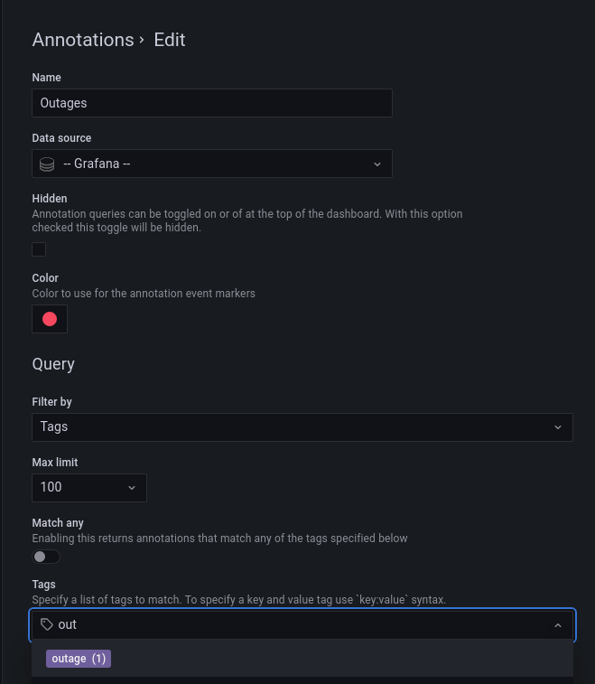 For example, create an annotation query name outages and specify a tag outage. This query will show all annotations (from any dashboard or via API) with the outage tag. If multiple tags are defined in an annotation query, then Grafana will only show annotations matching all the tags. To modify the behavior, enable Match any, and Grafana will show annotations that contain any one of the tags you provided.