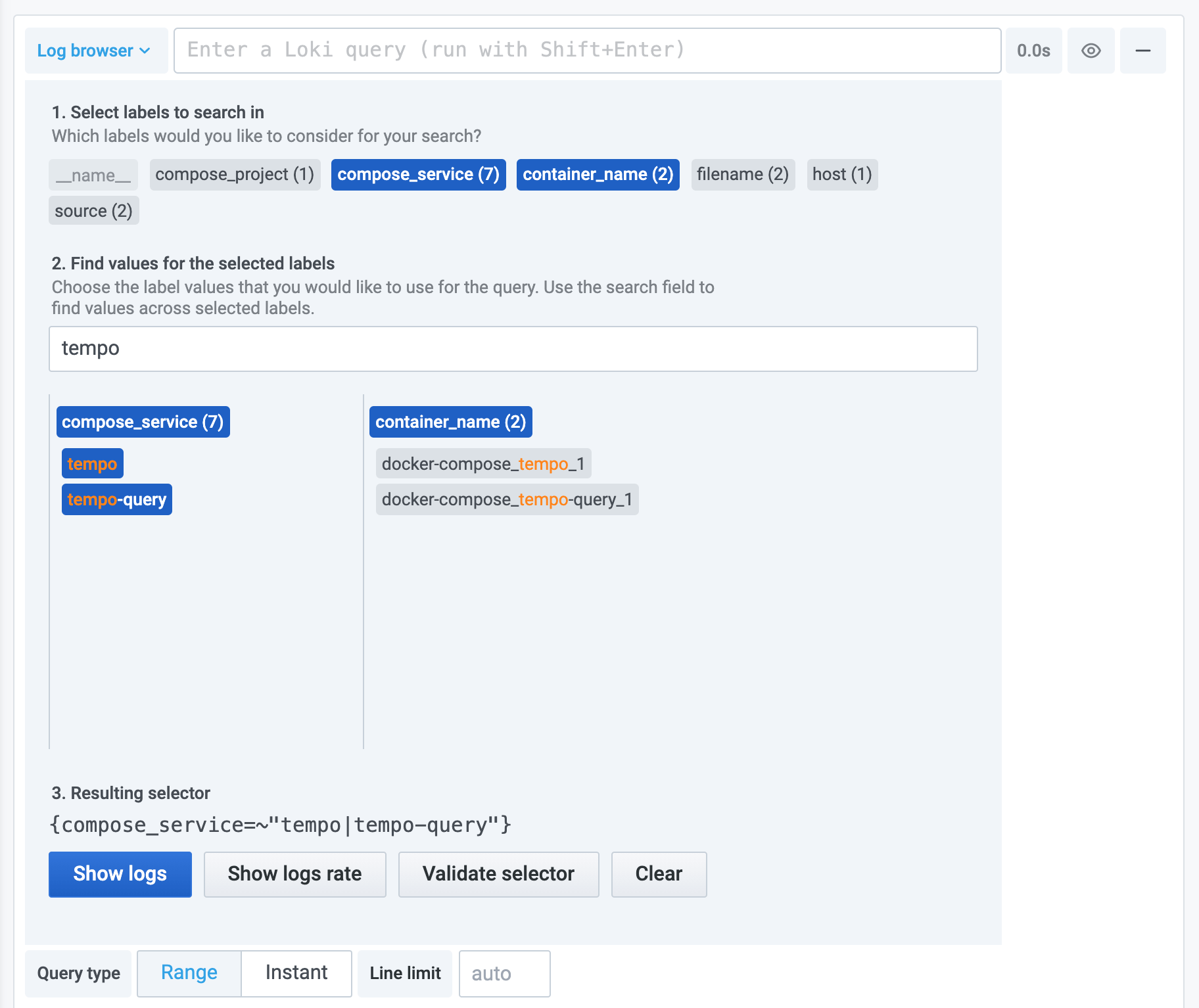 With Loki log browser you can easily navigate through your list of labels and values and construct the query of your choice. Log browser has multi-step selection: