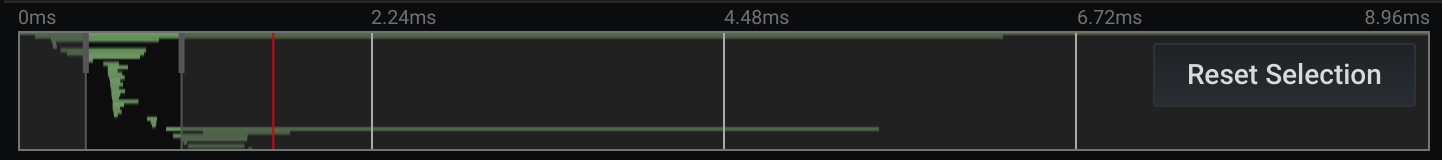 Shows condensed view or the trace timeline. Drag your mouse over the minimap to zoom into smaller time range. Zooming will also update the main timeline, so it is easy to see shorter spans. Hovering over the minimap, when zoomed, will show Reset Selection button which resets the zoom.