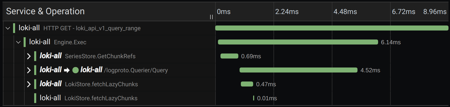 - Span duration bar: Visual representation of the operation duration within the trace.