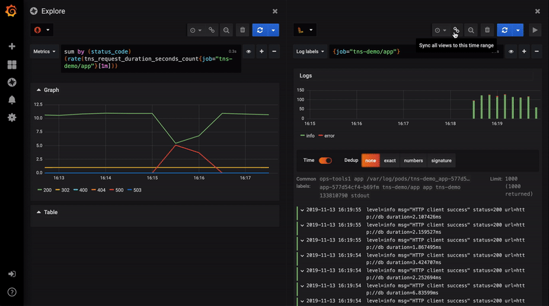 In the Explore split view, you can now link the two timepickers so that if you change one, the other gets changed as well. This helps with keeping start and end times of the split view queries in sync and will ensure that you’re looking at the same time interval in both split panes.