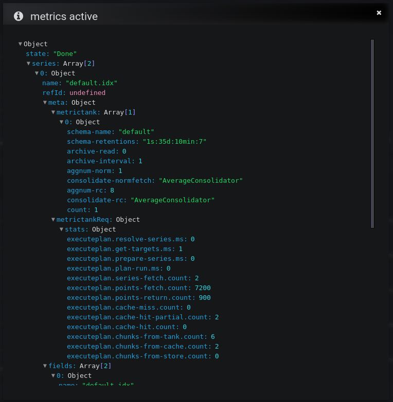 To see the metadata response from Metrictank you can inspect the response using the Query Inspector found in the panel queries tab. Grafana 6.5 includes a new Panel Inspector in alpha/preview where you also can see the metadata response from Metrictank. You can try it out by enabling a feature flag in the Grafana configuration file:
