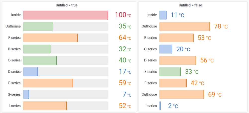 The Bar Gauge visualization has a new display option: Unfilled. This new option is enabled by default, so it will change how this visualization is displayed on old dashboards. If you prefer the old default – in which an unfilled area is not shown, and the value follows directly after – you have to update the visualization settings.
