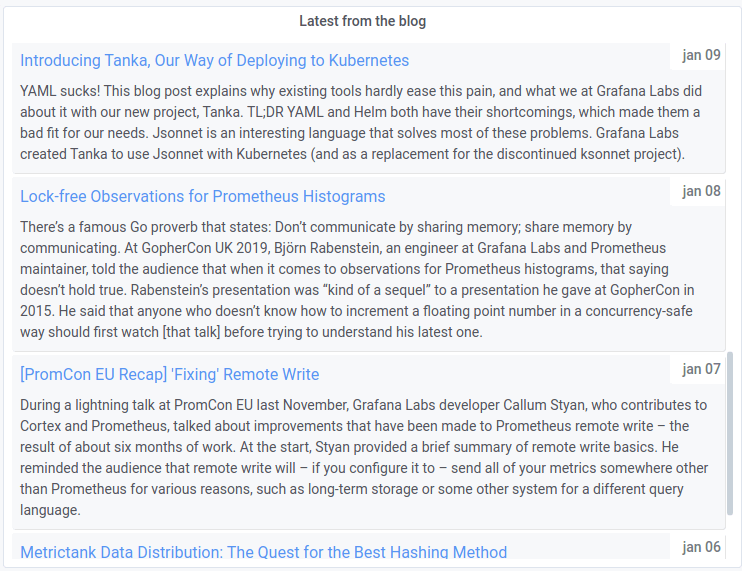 This panel shows RSS feeds as news items in the default home dashboard for v6.6. Add it to your custom home dashboards to keep up-to-date with Grafana news, or switch the default RSS feed to one of your choice.