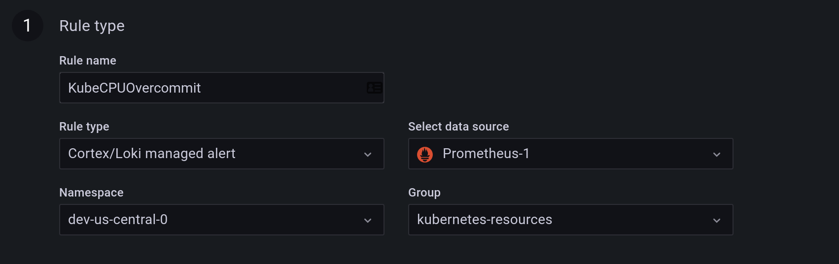 alertnamelabel for every alert instance that is created from this rule. - From the Rule type drop-down, select Mimir / Loki managed alert.